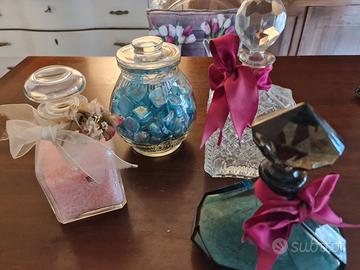 4 bottiglie e vasi vintage in vetro. Con decorazione.
