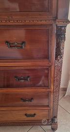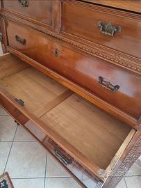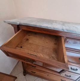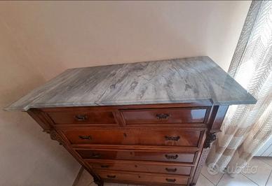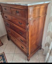 settimanale in noce di fine 800 restaurato 4 cassetti grandi 2 cassetti più piccoli colonne quadrate intarsiate marmo bianco con venature grigie