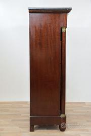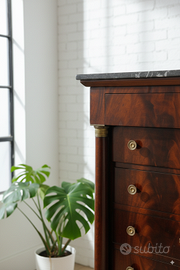 Settimanale in Mogano e piuma di mogano,del primo novecento,sette cassetti,fronte in piuma di mogano a macchia aperta distribuita su tutta l'altezza,colonne piene,bronzi originali,ferramenta originale,serrature funzionanti.Piano in marmo.