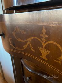 Elegante settimanale bombato a cinque cassetti, realizzato in legno di noce con splendidi intarsi floreali e a vaso su ogni fronte.