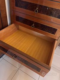 Il mobile presenta un’affascinante lavorazione frontale con inserti in pregiata radica di noce dalle venature calde e profonde, incorniciati da profili dorati che ne esaltano la geometria. La struttura è solida e poggia su tipici piedini a spillo dell'epoca.