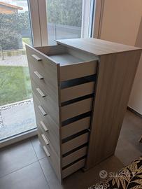 Cassettiera effetto olmo cenere composta da 7 cassetti in perfette condizioni. Dimensioni: altezza 130cm - larghezza 66cm - profondità 46.5cm Altezza cassetti a partire dall'alto: N.1 = altezza 14cm N.2= altezza 15.5cm N.3-4-5-6-7= altezza 18.5cm