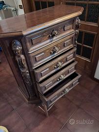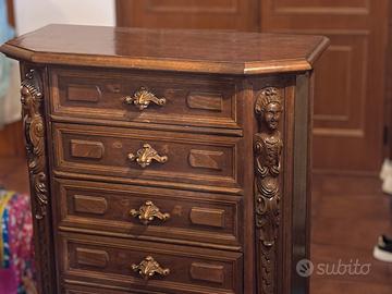 • Dettagli estetici: Due splendide lesene a cariatide (figure femminili) intagliate decorano gli angoli anteriori. Maniglie originali in bronzo/metallo dorato con motivo a foglia d'acanto.