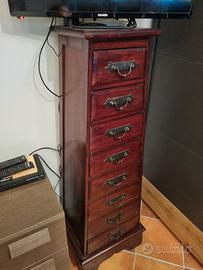 settimino in legno massello con maniglie in metallo anticato. in ottimo stato. 8 cassetti. struttura stretta e alta. altezza 1.50 cm larghezza massima in fondo 51 cm.