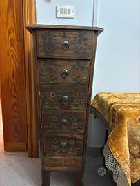 Settimino in stile indonesiano con decorazioni floreali dipinte a mano. Presenta 5 cassetti con maniglie ad anello. Realizzato in legno massello.