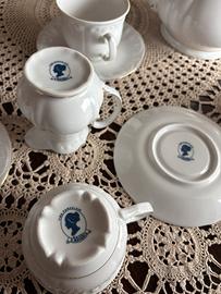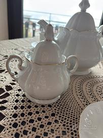 In perfetti condizioni. Composto da zuccheriera, lattiera, teiera, 10 tazze e 10 piattini. Porcellana di colore bianco lucido.