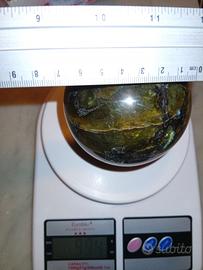 Sfera di labradorite. Diametro 7cm circa, peso 994g. Con base formata da tre angioletti.