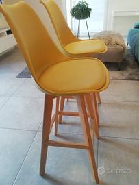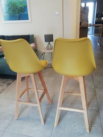 Sgabelli alti stile nordico con base in legno, scocca in polipropilene e seduta morbida in ecopelle. Altezza seduta 73cm, altezza schienale 40cm, seduta 45x40cm.