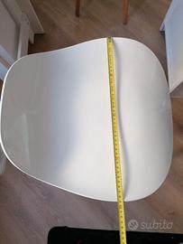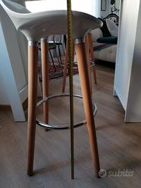 Due sgabelli con seduta bianca e gambe in legno chiaro e acciaio. Perfetti tranne un piccolo graffio su una delle due sedute. Misure in foto