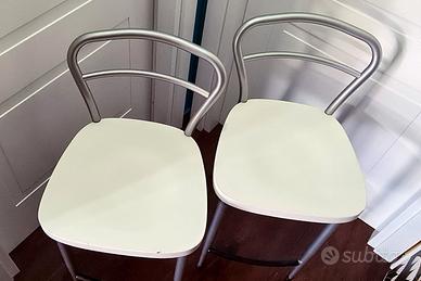 Coppia di Sgabelli, marca Calligaris. Robusta struttura in metallo argentato e seduta in legno laccato colore bianco naturale satinato. Dimensioni: Altezza seduta 60 cm Altezza spalliera 86 cm Sedile 39 x 40 cm.