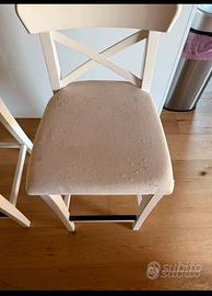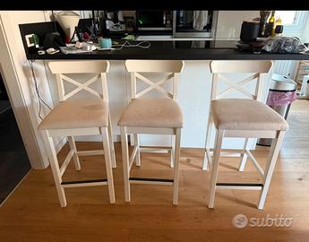 Vendo 3 sgabelli alti in legno di Ikea da rifoderare le sedute. Pagati 85€ cadauno. La struttura è perfetta, vanno solo rifoderati i cuscini in quanto avendo dei gatti in casa si sono divertiti con le loro unghie. Spedizione difficile quindi preferisco consegna a mano