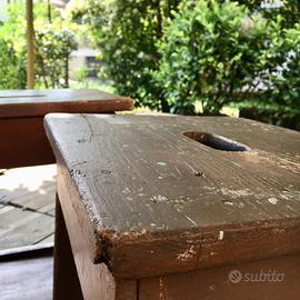 Coppia di Sgabelli industriale Vintage degli anni '50 in legno con foro centrale per sollevarlo agilmente, provenienti da un'officina.