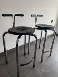 Sgabelli Ditta Magis modello Moto anni 80 in acciaio cromato lucido con seduta/schienale/piedini in gomma in buone condizioni. Altezza della seduta 66 cm. con lo schienale 83 cm. per penisola da cucina. Non trattabili