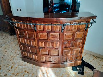Bancone bar in legno massello in stile spagnolo, spesso caratterizzato da dettagli in ferro battuto e cassetti o pannelli intagliati.