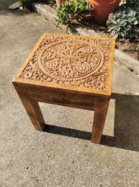 Piccolo sgabello in legno pianto intagliato con mandala decorazione floreale, come nuovo, solido, misure 28,5x28,5 altezza 31, acquistato alla rinascente