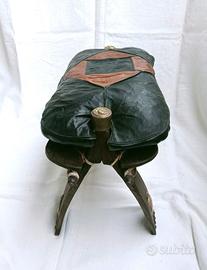 Sgabello a sella di cammello composto da una base in legno, facilmente richiudibile e un cuscino con rivestimento in pelle. Borchie in metallo. Misure massime 57 x 27 cm, altezza 37 cm. Possibilità di spedizione e di consegna a Gaggiano e limitrofi. Il ricavato verrà devoluto a scopo benefico.