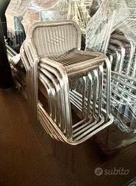 Sgabello alto da esterno, usato, struttura in alluminio, impilabile, poggiapiedi, seduta in vimini sintetico.