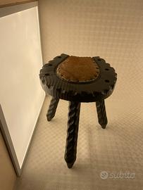 Sgabello antico artigianale in legno scolpito con seduta in pelle animale, realizzato a mano in legno massiccio con gambe tornite e scolpite.