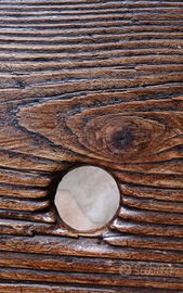 Vecchio sgabello mid-century, realizzato da un signore per sua moglie che vi voleva poggiare una grande pianta, da qui la realizzazione del foro al centro dello sgabello. Quando la signora innaffiava la pianta, l'acqua in eccesso scivolava via verso il foro evitando allo sgabello di marcire. Questa bellissima storia mi è stata raccontata dal nipote e mi ha anche confermato che non è mai stato esposto all'esterno.La texture del legno è bellissima e in rilievo, toccandolo sembra di accarezzare un albero, davvero molto rilassante ma ovviamente è una sensazione soggettiva. la seduta è ampia e lateralmente presenta una ammaccatura, non è un cerchio perfetto ma questo non impedisce il suo funzionamento, anzi lo rende unico. Le misure della seduta sono: