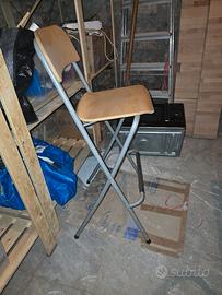 Sgabello bar con schienale, pieghevole, gambe acciaio e seduta in legno, altezza seduta 74 cm. buone condizioni