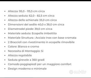Sgabello da Bar o da cucina, con schienale e braccioli, bianco, cromato, rotazione libera a 360°, la regolazione in altezza della seduta