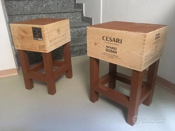 Sgabelli con casse di legno singoli o in coppia ( sconto). Altezza 50cm (60€) e più alti a 80cm.( 90€). Possibilità di creazione a scelta del brand di cassa, colore e altezza.