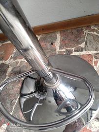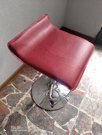 Sgabello con piedistallo in acciaio x e poggiapiedi, seduta in pelle rossa, leggermente scucito da una parte come da foto. Ottime condizioni.