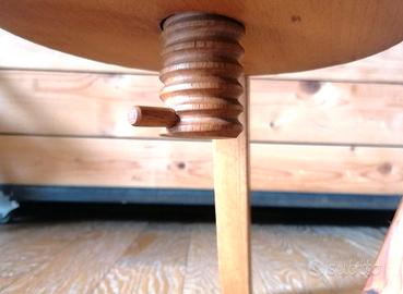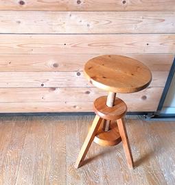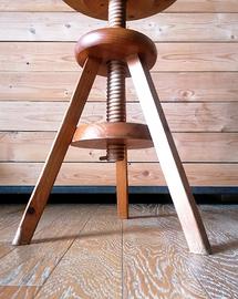 Sgabello vintage treppiede da artista / da lavoro in legno massello di larice a vite girevole (con fermo in legno per fine corsa) per regolazione in altezza, con traversa di rinforzo circolare. Misure seduta: diametro 30 cm, altezza seduta da terra min/ max 45 cm/ 59 cm