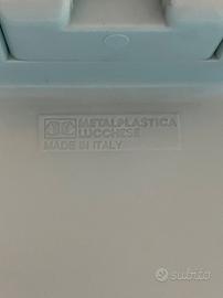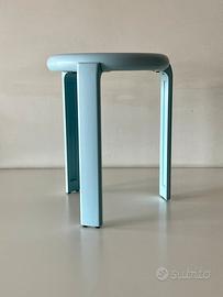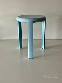 Stabile e robusto sgabello treppiede di design vintage modernariato in stile minimale anni 70/80 realizzato in melamina, modello originale ditta Metalplastica Lucchese, in eccellenti condizioni nella sua rara colorazione celeste puffo.