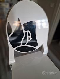 Sgabello Kartell One More - Design Philippe Starck - Originale Descrizione Vendo splendido sgabello One More di Kartell, un classico intramontabile del design firmato da Philippe Starck. Lo sgabello fa parte della celebre famiglia "Ghost", caratterizzato da una seduta confortevole e uno schienale ovale dall'eleganza senza tempo. Dettagli dell'oggetto: Modello: One More (versione con schienale ovale). Colore: Bianco coprente (lucido). Particolarità: Lo schienale presenta una decorazione grafica a contrasto (nera/rossa) che lo rende un pezzo unico e di grande impatto visivo. Materiale: Policarbonato tinto in massa, resistente e facile da pulire. Stato: Ottime condizioni generali, solido e senza difetti strutturali.