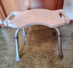 Sgabello per doccia in plastica e alluminio regolabile in altezza.