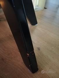 Sgabello nero per pianoforte. La parte della seduta è in pelle. Presenta alcune imperfezioni sulle gambe. Altezza regolabile.