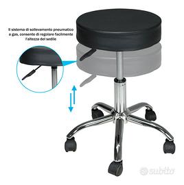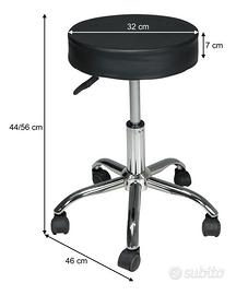Sgabello professionale estetista in ecopelle modello Alvin realizzato con materiali di ottima qualità che gli conferiscono robustezza e durevolezza nel tempo. Sgabello ufficio girevole dallo stile moderno, regolabile in altezza mediante pistone a gas tramite leva e seduta imbottita molto comoda. Sgabello professionale ideale per saloni di bellezza o parrucchieri grazie alle ruote pivotanti che consentono di spostarsi con grande facilità. Basteranno pochi minuti per montarlo, grazie alle istruzioni che troverete all'interno della confezione. Prodotto nuovo a prezzo di fabbrica. Scheda tecnica Dimensioni: 46x46x44÷56(h) cm, seduta Ø32 cm; Peso: 2,8 Kg; Rivestimento: Ecopelle; Colore: Nero.