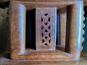 Sgabello africano tradizionale Ashanti intagliato a mano. Di design elegante è scolpito da un unico pezzo di legno - per arredare soggiorno, camera da letto o altro visto la versatilità dell'oggetto. Dimensioni: Base 55,5 cm x 30 cm. Altezza totale 37,5 cm. - Dimensioni seduta 55,5 x 36 cm.