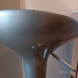 Sgabello da cucina bar con sedile grigio metallizzato, base in metallo cromato e poggiapiedi.