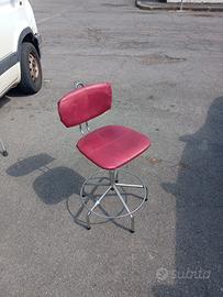 Sgabello industriale vintage rifoderato di pelle di colore rosso.