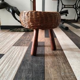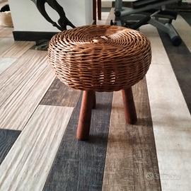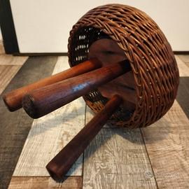 Sgabello in rattan vintage anni 50 stile mid-century, interamente fatto a mano seduta in rattan piedi in noce, attribuibile al Designer Tony Paul.