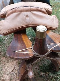 Sgabello,tipo sella camello, fatto di materiali naturali, legno ,cuoio.artigianato .colori marone.un altro colore rosso.con segni d usura,ma solido e comodo.possibile trasporto in zona VB fino Milano. Info whatsapp 3487426741.prezzo X un sgabello