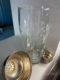 1 Shaker in vetro e silver con piccola ammaccatura su silver. Bicchiere perfetto con indicate dosi per martini, martini dry, red liin, rob roy, vodka dry, manhattan e bronx.
