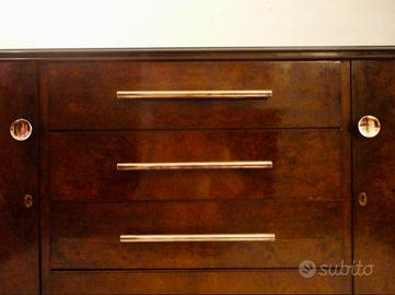 Sideboard Art Deco anni 30 di design, in radica di palissandro, con maniglie in rame e ottone originali, 4 cassetti, 2 sportelli con 2 ripiani ciascuno. Dimensioni: 1,90 per 51 (altezza 90).