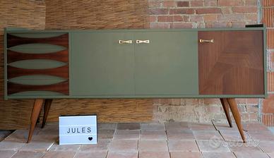 Sideboard, credenza restaurata e verniciata in un verde kaki moderno. Le parti in legno sono protette da un olio opoco e incolore.
