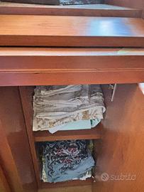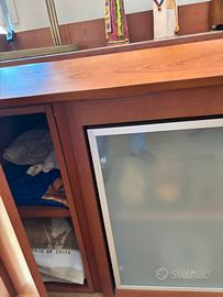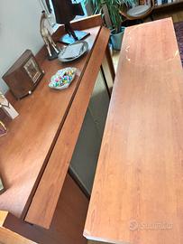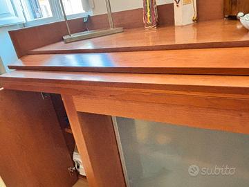 Per traferimento vendo bellissimo buffet sideboard con tavolo acquistato da Arkon a Roma via della Scrofa a 1500 euro. Mobile buffet con due ante laterali e due centrali in vetro satinato. Misura 203x 50. Che contiene il Tavolo estratto chiuso misura 185 x 45 e aperto 185x 90. Come si vede ha la parte della lucidatura spessa del legno che sta venendo via, perché è stato esposto troppo al sole. È anche più bello lasciarlo solo legno vivo (era una tecnica usata per aggiungere ulteriore protezione). Per togliere quella pellicola si riesce a farlo abbastanza facilmente mi disse il falegname (con un po’ di impegno si fa da soli) e renderlo quindi uniforme.