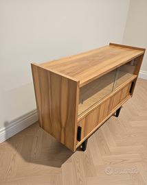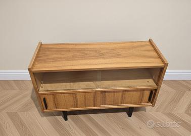 Mobile originale d’epoca, con ante scorrevoli (una in vetro) e piedi neri inclinati tipici del design mid-century. Perfetto per dare un tocco retrò a soggiorno, ingresso o studio.