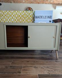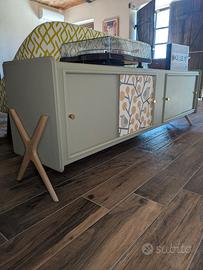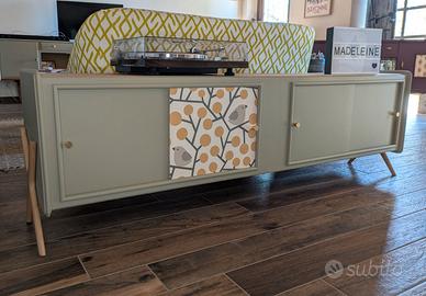 Mobile anni ’50 completamente restaurato e reinterpretato attraverso un progetto di redesign contemporaneo. Ogni fase del lavoro è stata eseguita artigianalmente: dalla preparazione della superficie alla finitura, fino alla scelta della palette cromatica e dell’elemento decorativo, pensato per creare un equilibrio tra estetica vintage e sensibilità moderna. La tonalità verde salvia opaco valorizza le linee pulite del mobile, mentre l’anta decorata introduce un elemento grafico distintivo, trasformandolo in un vero pezzo d’arredo, non solo funzionale ma espressivo. Le gambe richiamano il design mid century, rendendolo perfetto per ambienti ricercati, contemporanei o di ispirazione nordica. Non si tratta di un semplice mobile riverniciato, ma di un pezzo unico, pensato per chi cerca carattere, qualità e identità negli oggetti che sceglie per la propria casa. Misure: 176,5 x 35,5 x 54 (h) Chiedimi pure altre foto. Sono Sonia e faccio relooking di mobili per dare loro una nuova vita. Mi trovo a Roatto (AT) ma la consegna è possibile. Seguimi su Un gatto nel cassetto (Ig e FB)