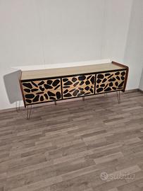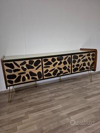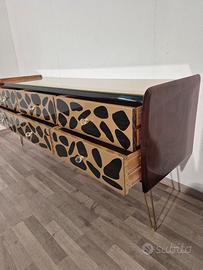 siderbord originale e restaurato anni 60 struttura in tamburato di legno con sei cassetti rivisitati color oro e nero lucido piano in vetro color oro gambe in ottone popoli trasparente
