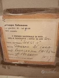 Certificazione: Il retro del quadro conserva il cartiglio originale della partecipazione al "1° Premio Nazionale di Pittura della Tavoletta - Città di Cossato", documento che ne attesta l'autenticità e la storicità.