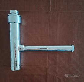Sifone per scarico lavandino. Nuovo. Mai usato perché acquistato per errore. Design moderno e minimale. In plastica effetto cromato. Fornito di rotella da applicare sul muro. Fornito di gommini. Marca: Bonomini.