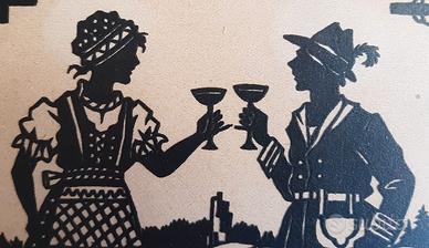 Ritrae una giovane coppia in abito tradizionale che brinda. La coppia è incorniciata da tralci di vite, sullo sfondo un paesaggistico con monti, boschi e elementi architettonici.