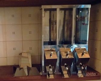 Silos per caffè in acciao inox e vetro marchio IGV a 3 posti , capacità 1 Kg per scomparto. Misure : H 50 cm P 12 cm Larg 33 cm. Da parete e/o retrobanco.
