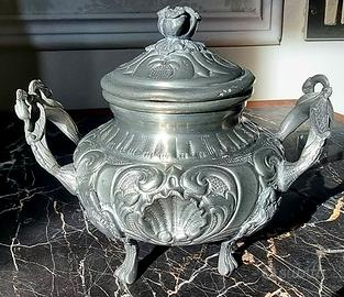 Questa rara scatola italiana con gambe eleganti è realizzata in peltro intagliato in argento di alta qualità. Il ricco rilievo con conchiglie, fiori e linee fluide evoca l'antico arredamento italiano. Poggia su tre gambe in miniatura e il coperchio è decorato con un intreccio scultoreo. Massiccia e pesante, è decorata con rilievi neobarocchi, ogni linea ricorda gli ornamenti dei palazzi del Nord Italia.